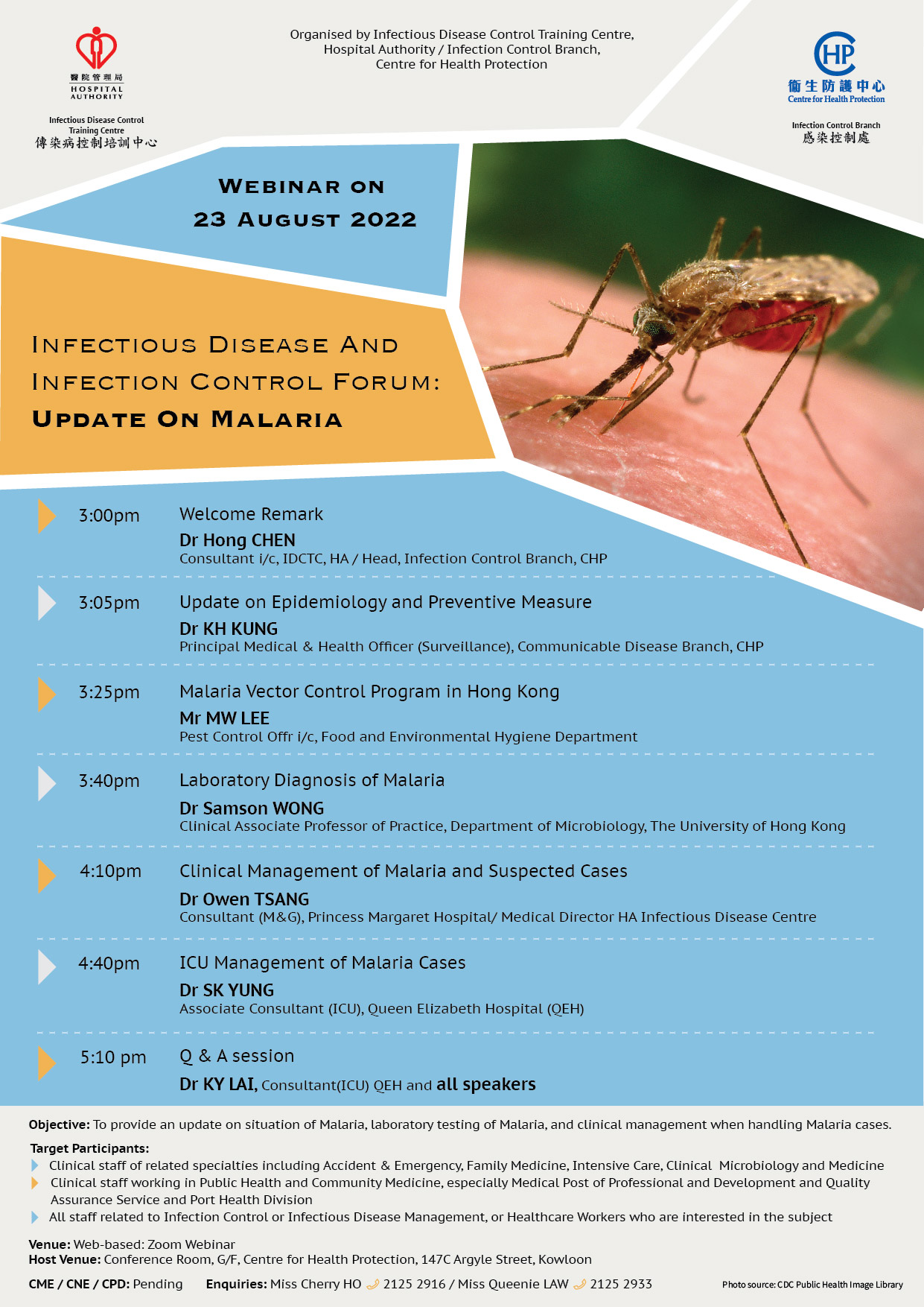 | Content | To provide an update on situation of Malaria, laboratory testing of Malaria, and clinical management when handling Malaria cases. |